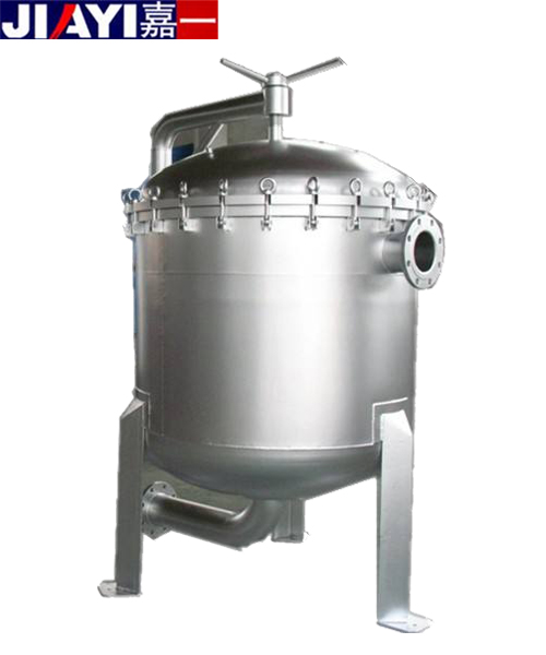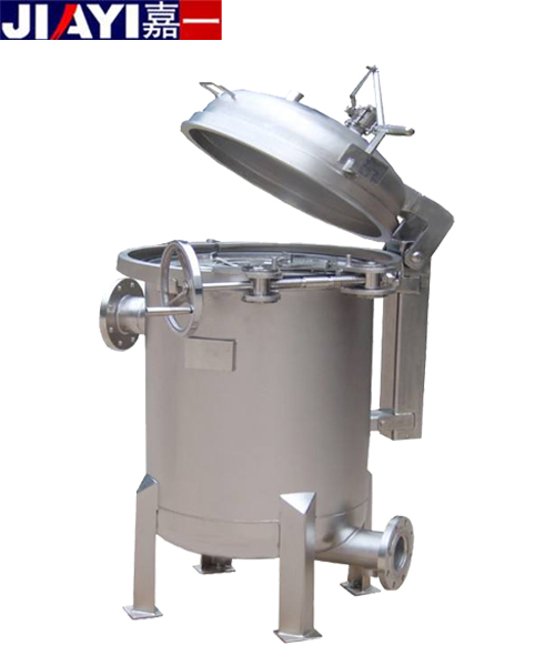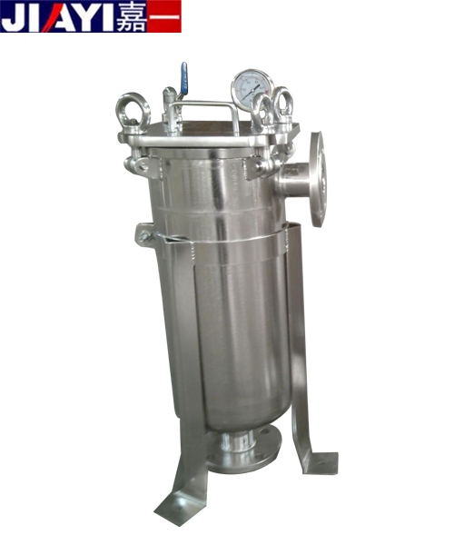 袋式過濾器的結(jié)構(gòu)設(shè)計是由四套搖錘式環(huán)首螺栓將頂蓋和濾筒密封鎖緊,使過濾器更能承受極高的過濾壓力和水錘式的壓力沖擊。袋式過濾器由濾筒,過濾網(wǎng)籃,過濾袋三部分組成,結(jié)構(gòu)緊湊簡單;要過濾的液體經(jīng)過濾器的進(jìn)口進(jìn)入,流進(jìn)過濾袋,經(jīng)過濾袋的攔截后,由過濾器的出口流出。袋式過濾器的進(jìn)出口設(shè)計一般采用側(cè)進(jìn)底出方式,方便清洗。更換過濾袋簡單快捷, 首先,先關(guān)閉進(jìn)水閥門,打開排氣閥,讓過濾器里面的壓力降到常壓;第二步,打開頂蓋上的四套環(huán)首螺栓,打開頂蓋;第三步,打開固定過濾袋的卡環(huán),提出堵塞的過濾袋,換上新的過濾袋;第四步,關(guān)閉頂蓋,鎖緊四套環(huán)首螺栓;第五步,打開進(jìn)水閥門,等排氣閥有液體流出時關(guān)閉排氣閥。總個過程一般在10-15分鐘左右完成。過濾器的維護(hù):一般當(dāng)過濾器的壓差達(dá)到2-3公斤時,證明過濾袋已經(jīng)基本上堵塞了,這時過濾器的出口流出的液體也很少了,這時候應(yīng)該更換過濾袋。根據(jù)使用的不同情況,如果工序要求需要保持過濾器的流量不低流量的一半,應(yīng)該在壓差達(dá)到1公斤左右時更換過濾袋。過濾袋的使用壽命由原水的濁度、過濾的時間、過濾的流量、過濾袋的過濾面積來決定。