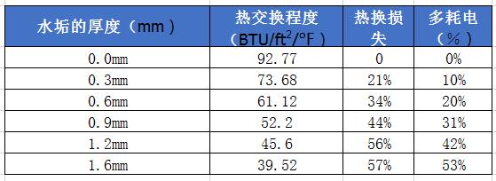 水垢的厚度與換熱損失和設備耗電的關系表