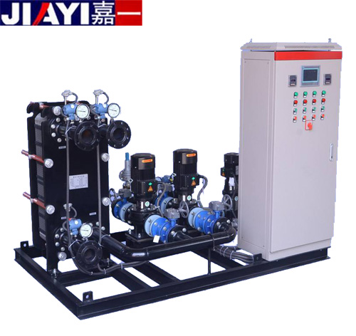 板式換熱機組,為換熱機組的一種型號,其特點是采用板式換熱器,在相同壓力損失情況下,其傳熱系數比管式換熱器高3-5倍,占地面積為管式換熱器的三分之一,熱回收率高。設備由板式換熱器、智能溫控裝置、智能電控裝置、循環泵、補水泵、穩壓膨脹水箱、補(凝)水箱、過濾器、閥門、儀表、傳感器、配管底座等組成。