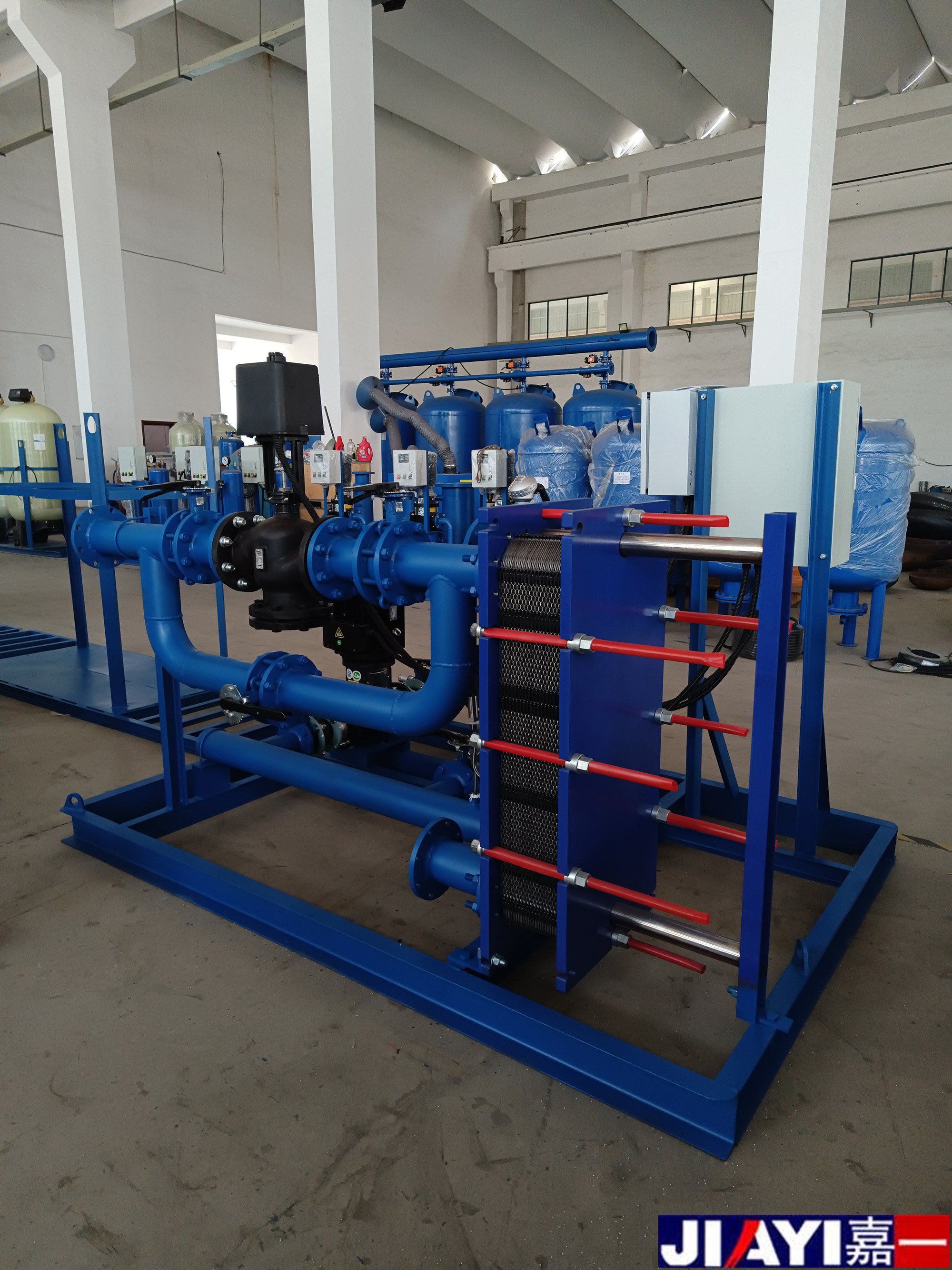 板式換熱機組,為換熱機組的一種型號,其特點是采用板式換熱器,在相同壓力損失情況下,其傳熱系數比管式換熱器高3-5倍,占地面積為管式換熱器的三分之一,熱回收率高。設備由板式換熱器、智能溫控裝置、智能電控裝置、循環泵、補水泵、穩壓膨脹水箱、補(凝)水箱、過濾器、閥門、儀表、傳感器、配管底座等組成。